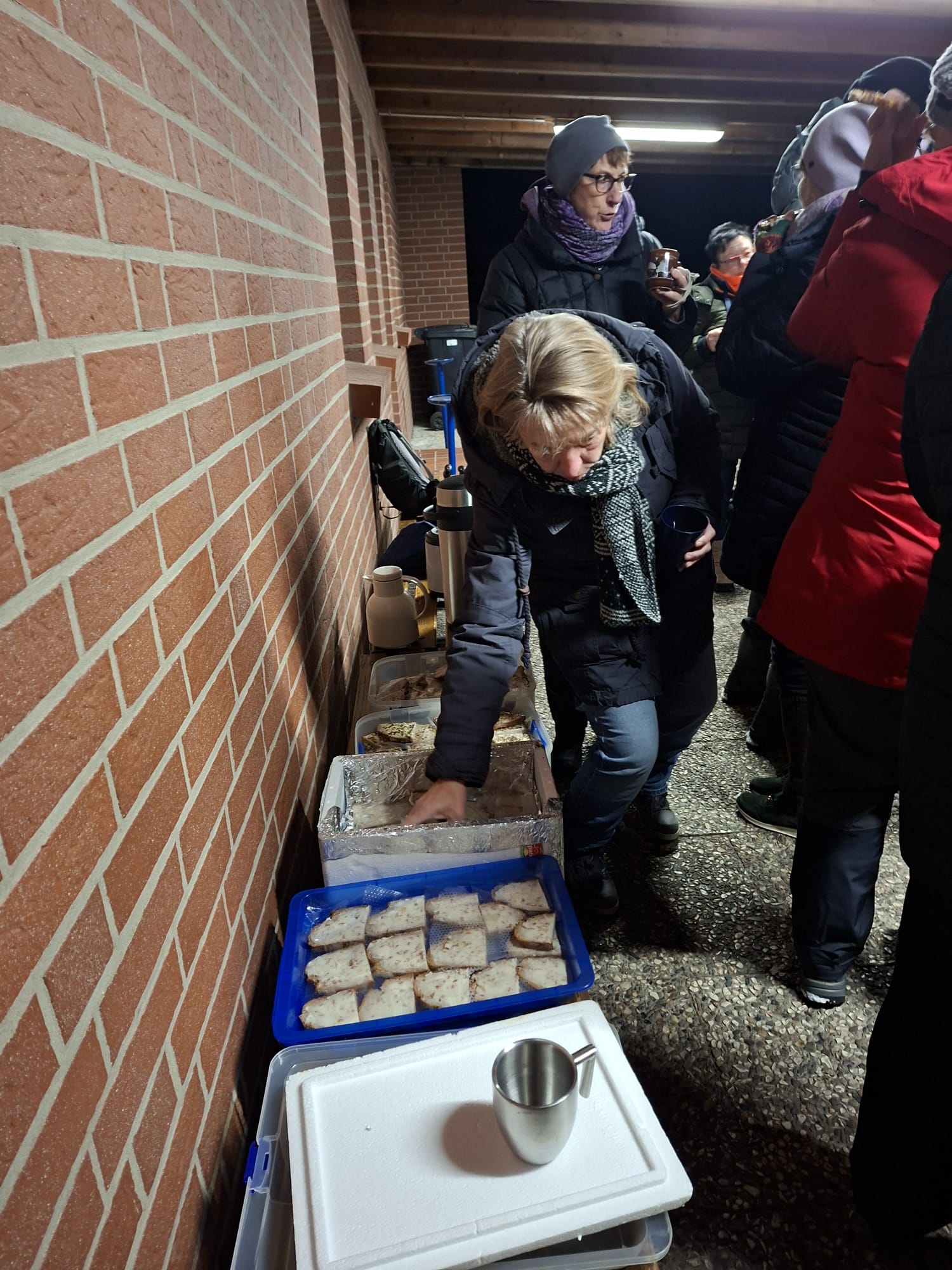 Nach einer Stärkung mit verschiedenen Schmalzbroten – darunter auch ein vegetarisches Schmalz, Glühwein rot und weiß und leckerem Tee, ging die Wanderung – na gut -es war nur ein Spaziergang, durch unser Dorf los.