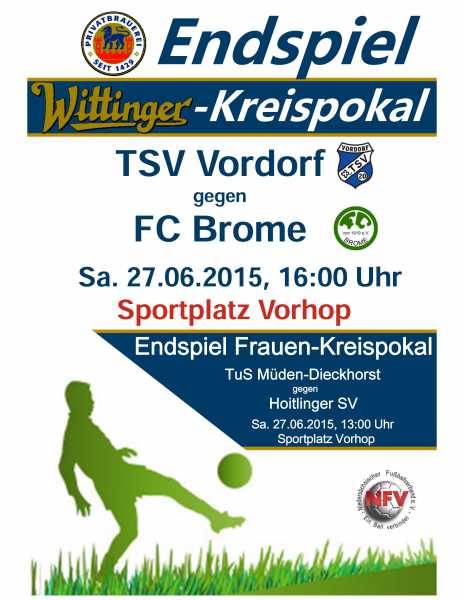 Unsere 1. Herren bestreitet am Samstag den 27.06.2015 um 16:00 Uhr das Wittinger-Kreispokalfinale gegen den FC Brome in Vorhop. Hierzu hat die Mannschaft einen Fanbus für die Blau-Weiße Anhängerschaft gechartert. Abfahrt ist um 15:00 Uhr am Sportplatz Vordorf. Neben dem Bus stellt die Scheil-Elf auch den flüssigen Proviant für die Fahrt und übernimmt sämtliche Kosten aus der Teamkasse. Noch sind Plätze frei!!!! Die Teilnahmeliste liegt am Getränkestand der Vordorfer Sportwoche aus. Wer noch Interesse hat, sollte sich beeilen und in die ausliegende Liste eintragen.